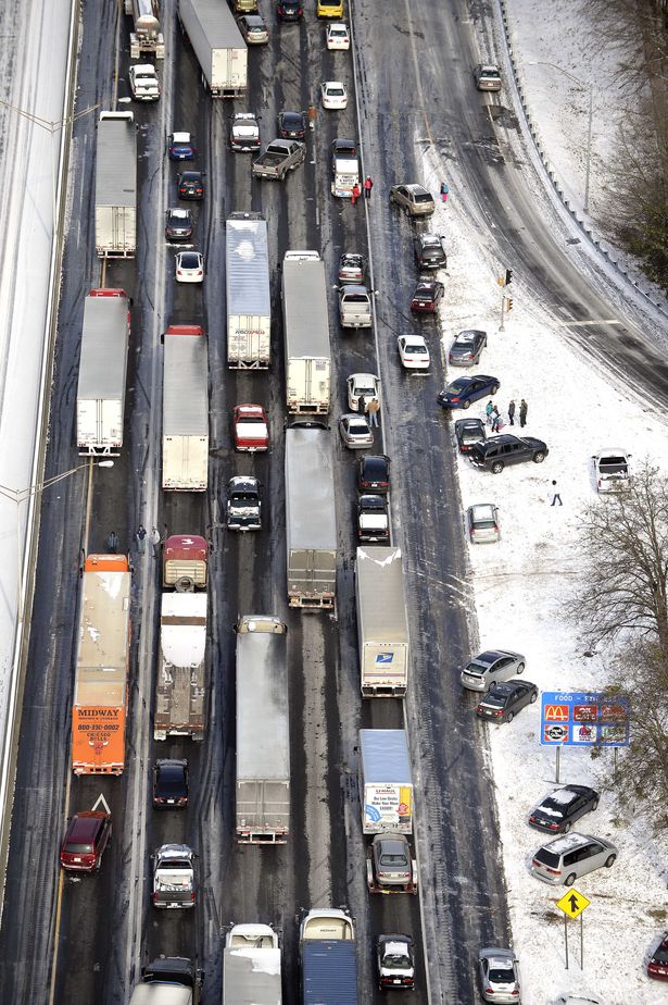Courtesy of the AJC. Motorists chat outside their vehicles after spending the night on the highway @ I-75 and Moores Mill Road, Atlanta, Wednesday, January 29, 2014.